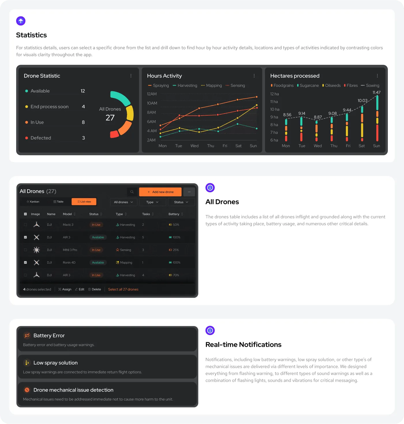 Here’s a clearer rephrasing:We started with UX research and built detailed user personas to represent all foreseeable drone-system users. These included farmers looking to better monitor irrigation—identifying where water is most needed and where it’s being wasted—and ranchers focused on tracking and managing grazing herds to prevent overuse of specific pasture areas.