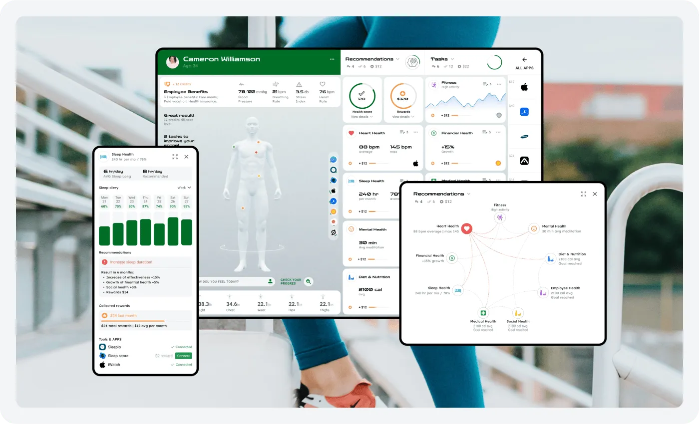 The dashboard UX/UI was designed to offer users flexibility in accessing information. It provides high-level recent data based on activity and offers statistics for group efforts and campaigns per organization, as well as individual employees. The company health score, developed using key metrics set by managers, allows leadership to track progress over time and identify areas where activity may have declined among staff. It also highlights the most active employees and their spending habits with earned rewards.