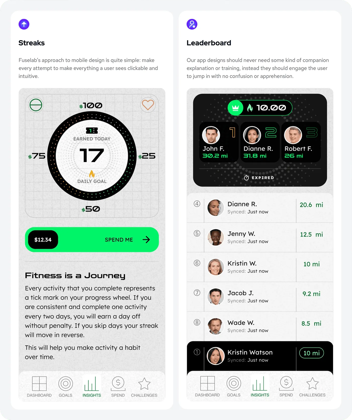 At the core of any mobile health app is building a consistent routine supported by multiple reminders and encouragement. The mobile dashboard balances motivating visuals of dollars earned with calories burned, while also showing how activity streaks have increased both over time. Finally, on the same screen, users can compare their activity with coworkers and with specific groups they’ve joined.