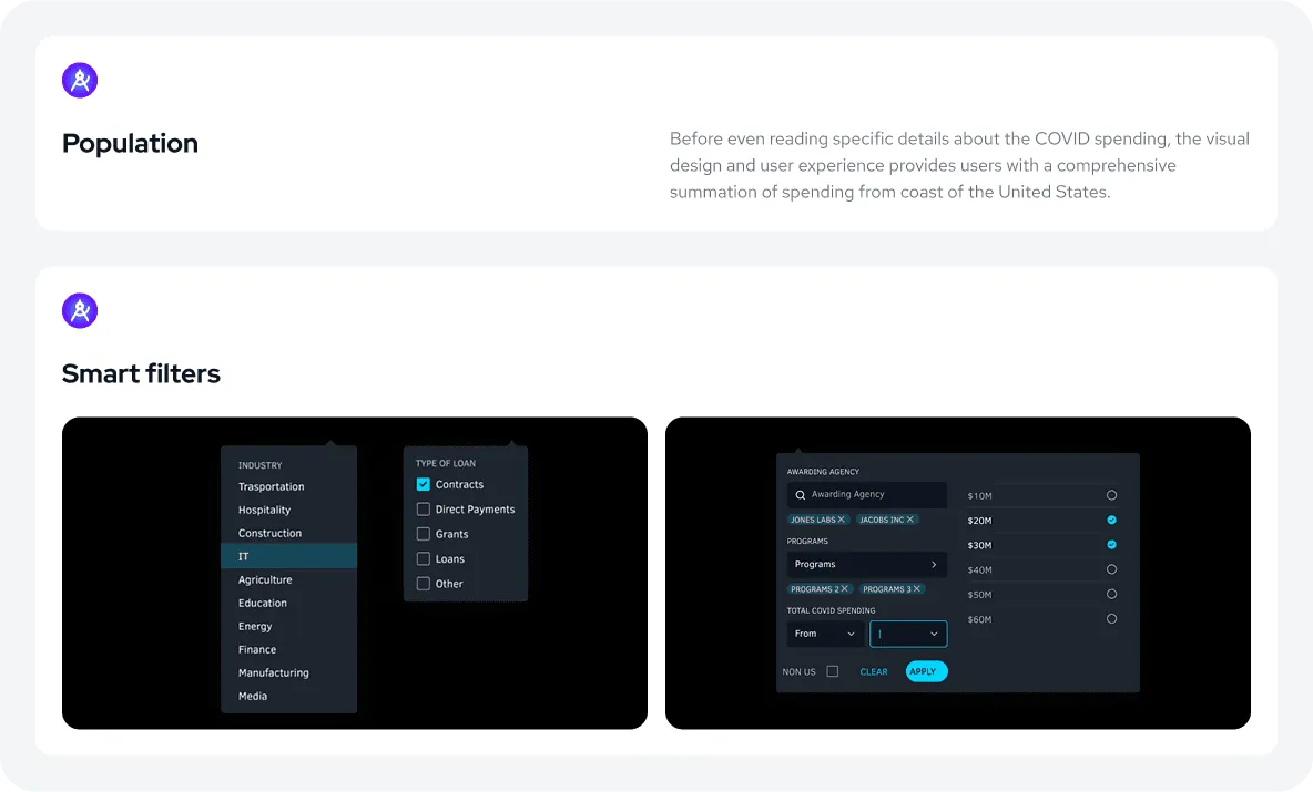 This tracker provides users with the ability to explore government spending nationwide, as well as through specific filters such as population, ethnicity, and unemployment rates—an unprecedented level of insight not offered by any other COVID spending tracker.